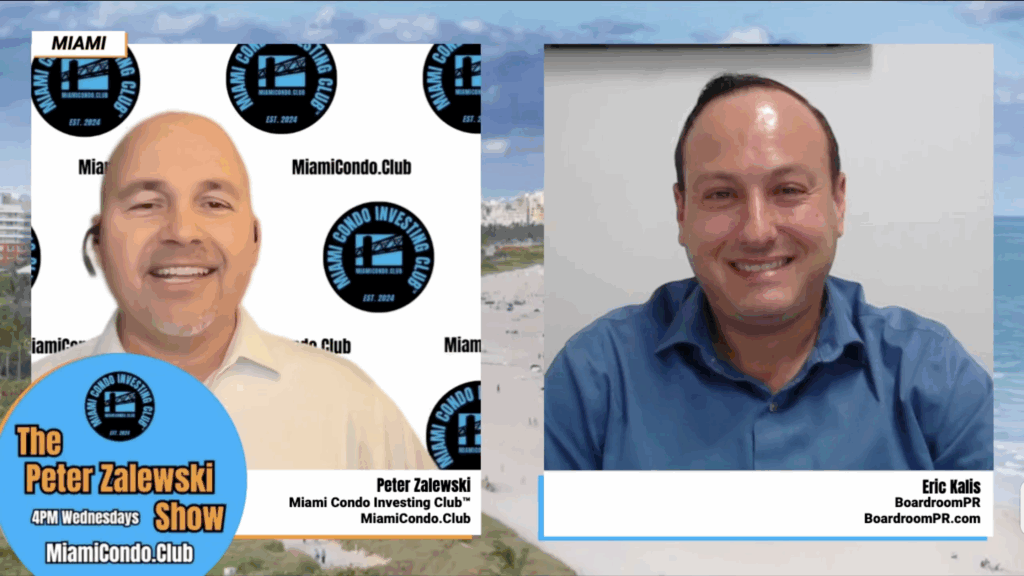 BoardroomPR Senior Vice President Eric Kalis appeared on Miami real estate podcast The Peter Zalewski Show to discuss how condominium developers should navigate volatile market and economic conditions during a pivotal winter buying season. Kalis, a seasoned public relations professional with a deep background in real estate journalism, shared his insights in a spirited one-on-one conversation with Zalewski and described BoardroomPR’s top PR and Social Media services.